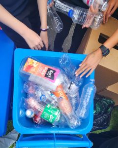 The Beautification Trust brought wheelie bins, and the school had been pre-collecting containers in large sacks. Students queued to hand in their empties, with the three student leaders tallying items using clipboards and paper.
